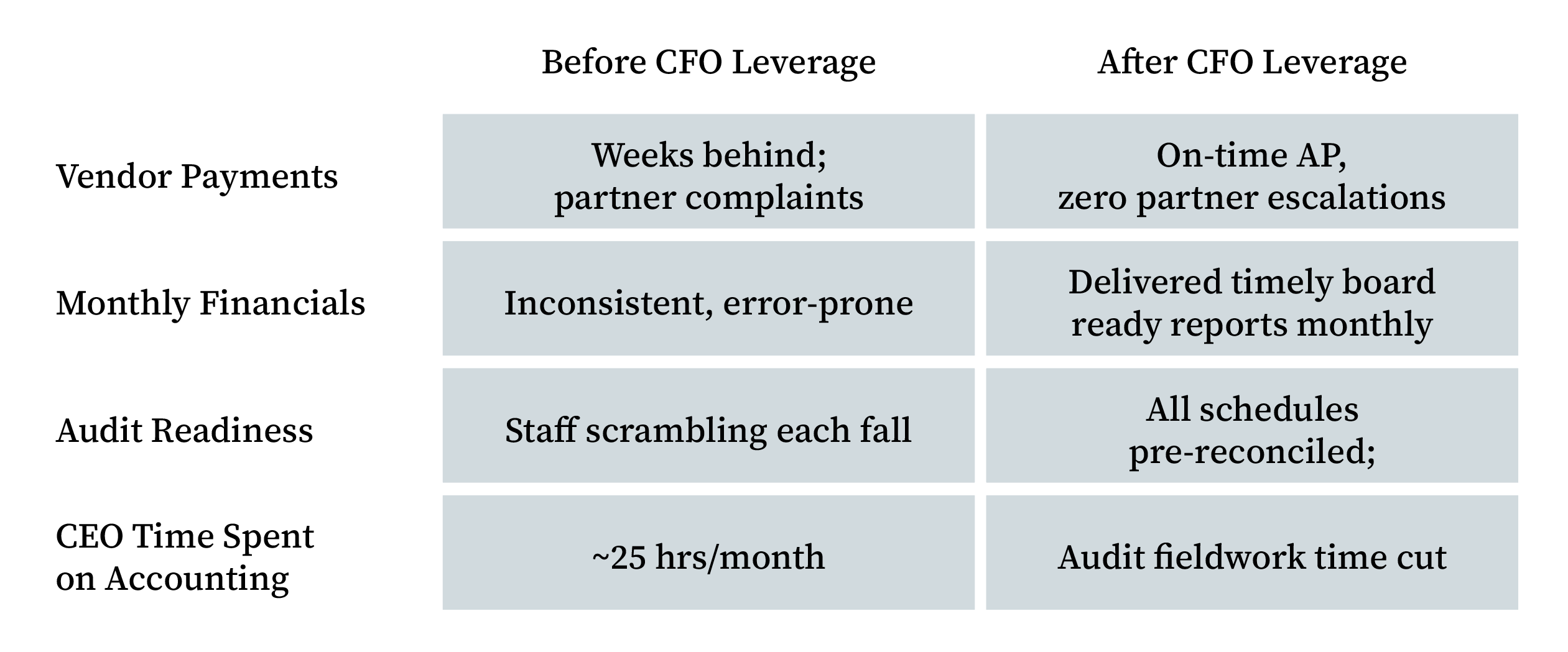 To meet the growing complexity of its financial operations, The Works, Inc. turned to CFO Leverage for a fractional finance team that could scale with its needs. The partnership began with essential bookkeeping services like bank reconciliations, monthly financial reporting and audit preparation. Over time, the engagement expanded to include full accounts payable support and strategic oversight from a fractional CFO. With deep nonprofit and real estate experience, the CFO Leverage team quickly adapted to the organization’s unique structure—implementing clean internal controls, streamlining financial workflows and delivering reliable, board-ready reporting. This flexible and responsive model allowed The Works to regain financial clarity and stability without the burden of hiring and managing an in-house finance department.